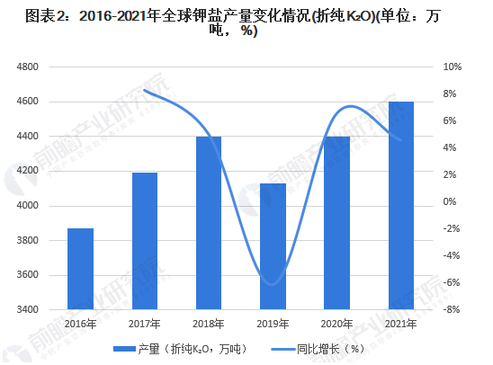 從全球鉀鹽總產(chǎn)量來看,2016-2021年全球鉀鹽產(chǎn)量整體呈現(xiàn)波動(dòng)增長態(tài)勢。2021年,全球鉀鹽的礦產(chǎn)品產(chǎn)量達(dá)到4600萬噸(折純KO),同比2020年增長5%。