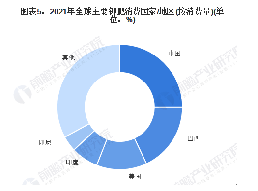 鉀肥的消費(fèi)主要與地區(qū)農(nóng)作物種植面積和施肥量有關(guān)。目前,全球主要的鉀肥消費(fèi)國有中國、巴西、美國和印度等。2021年,中國鉀肥消費(fèi)量占全球的比重約25%,其次是巴西和美國的消費(fèi)量占比均在10%以上。