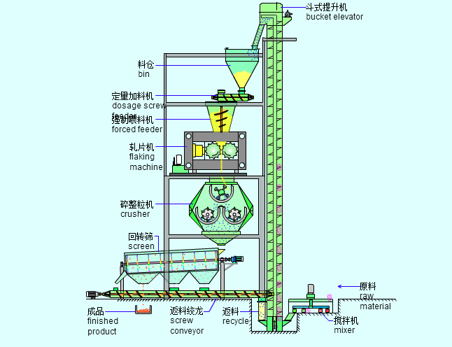 各種干粉物料從設(shè)備頂部加入,經(jīng)脫氣、螺旋預(yù)壓進(jìn)入兩個平等軋輥,軋輥相對旋轉(zhuǎn),物料被強制送入兩輥之間,軋輥將物料咬入輥隙進(jìn)行強制壓縮,物料通過壓縮區(qū)后,物料的表面張力和重力使之自然脫出。脫出后的指條狀團(tuán)塊進(jìn)入碎粒機由旋轉(zhuǎn)刀排破碎,被破碎的物料進(jìn)入整粒機通過滾動刀排使顆粒和部分粉狀物料進(jìn)入旋振篩進(jìn)行篩分。合格品通過輸送機被送入成品倉。粉狀篩下物料通過輸送機再次被送回原料倉進(jìn)行二次輥壓,擠壓力的大小可根據(jù)造粒操作的需要由液壓系統(tǒng)進(jìn)行調(diào)節(jié)。 通過改變輥面開槽形式,可得到片狀、條狀、扁球狀等物料。